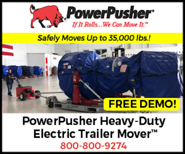 | | | | Sponsored | From PowerPusher, Div. of Nu-Star, Inc. Power Pusher's Heavy-Duty Electric Trailer Mover™ safely moves all types of ground support equipment including engines, generators, small aircraft and more. This powerful electric mover delivers 35,000 lb. push/pull capacity on tires or casters. Our movers improve operator safety and increase productivity by transporting heavy loads without excess exertion and muscle strain. |
