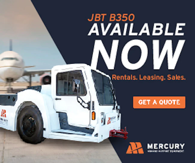 | | | | Sponsored | From Mercury GSE Mercury GSE now has the JBT B350 Pushback Tractor in stock. Engineered for efficiency, reliability, and durability, it handles all regional jets, A320, and B737 families in any weather. Built with heavy steel weldment construction and industry-proven transmission and axles, it ensures top performance. Safety features reduce accidents and injuries. Standard weight: 35,000 lb.; Max weight: 40,000 lb.; Draw Bar Pull: 24,000 lb. |